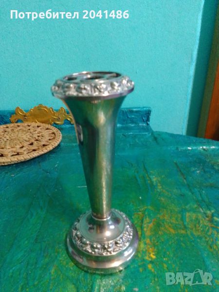 Старинна английска посребрена ваза 14 см диаметър 4.5 см за малки цветя в добро състояние.Датирана 1950г.Аналогичен екземпляр на друга платформа за продажби е оценена на 110 лева!