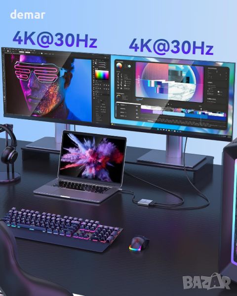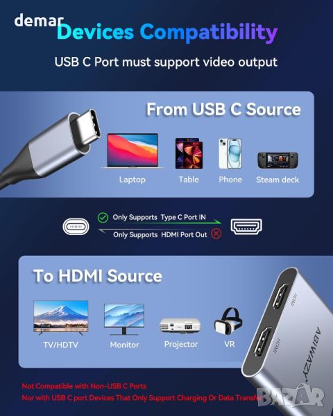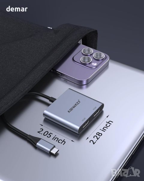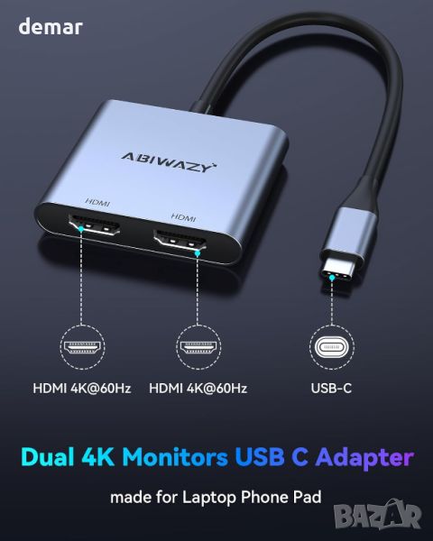 USB C към HDMI адаптер, HDMI сплитер за два монитора, 2-IN-1