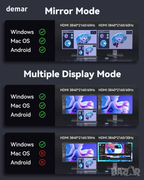 Този USB C към двоен HDMI адаптер е компактно и леко решение само с 50 грама и 14 кв. см, идеален за преносима употреба в офиси, конференции и мултимедийни среди. Той поддържа зашеметяващи 4K визуализации при 60Hz за един дисплей или 30Hz за два дисплея без нужда от допълнителни драйвери, предлагайки простота на plug-and-play. Съвместим с повечето модерни лаптопи, таблети и мобилни телефони от висок клас, той осигурява безпроблемна връзка с различни размери на дисплея за оптимално качество на гледане.
