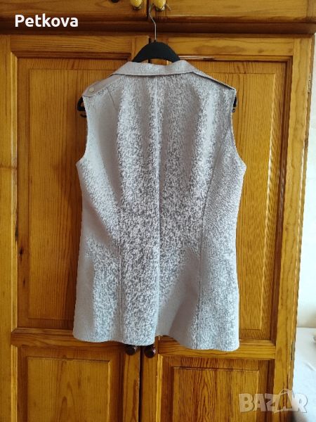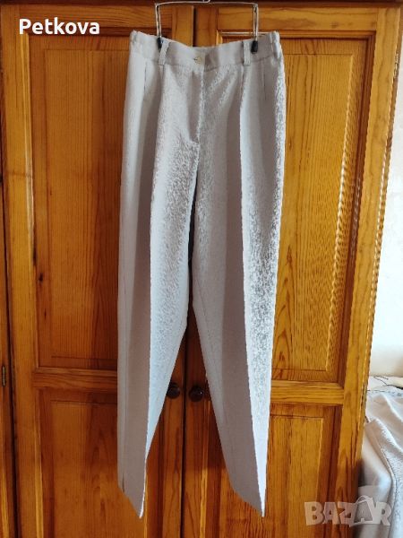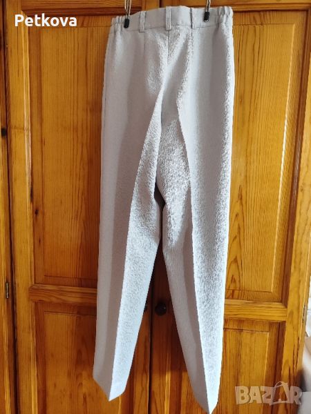 Костюма е от елегантен плат, обличан е за един повод. По етикет е 46 бълг.номерация, отговаря на М размер. Размери на панталона; дължина 96см, талия 35см, ханш 47см, всички р-ри са едностранно. Има еластен.