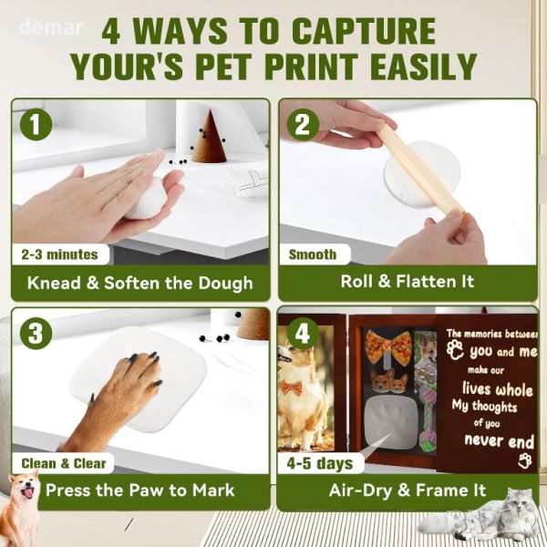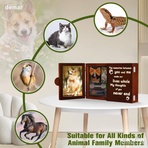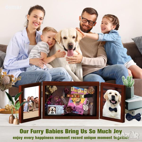 Тази изящна мемориална рамка за картина е замислена почит към любимите домашни любимци. Изработен от първокласно дълготрайно дърво и покрит с ултрапрозрачен акрил, той включва деликатни гравюри и побира три снимки с четири опции за показване, което позволява поставяне върху камини, маси или плотове. Рамката осигурява достатъчно място за показване не само на снимки (с размери 4x6 или 5x7 инча), но и на ценни предмети за домашни любимци като каишки, нашийници, играчки и дори отпечатъци от лапи на домашни любимци. Включеният комплект глина за сушене на въздух предлага изживяване „направи си сам“ за създаване на траен отпечатък от лапата на вашия домашен любимец, улавяйки уникален момент завинаги. Тази мемориална рамка служи като утешителен подарък за всеки, който скърби по загубата на домашен любимец, капсулира спомени и моменти по красиво персонализиран начин. Комплектът включва дървена рамка, акрилни листове, снимки, преграда, глина и инструменти за отпечатване, подаръчна кутия и шаблон за писмо, предоставяйки всичко необходимо за създаване на ценен и лечебен спомен.