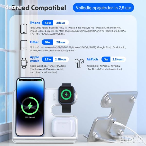 Това безжично зарядно устройство 3-в-1 от алуминиева сплав предлага стабилно, универсално решение за зареждане за множество устройства, съвместимо с най-новата серия iPhone, iWatch 8/Ultra/7/6/SE/5/4/3/2 и AirPods Pro2 /Pro1/3. Той разполага с усъвършенствана технология за безжично зареждане, която зарежда устройства за около 2,5 часа и включва 20W адаптер. Неговият подвижен и преносим дизайн, допълнен от платнена чанта за съхранение, го прави идеален за пътуване. Зарядното устройство е проектирано със силиконови подложки против хлъзгане и може да зарежда през калъфи с дебелина до 2,5 мм, което гарантира удобство и стабилност на устройството. Пакетът е пълен с всички необходими аксесоари