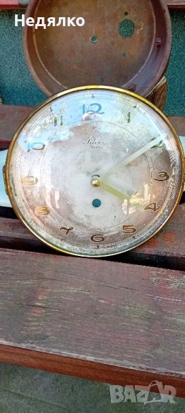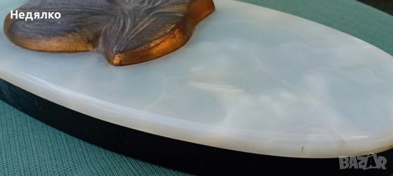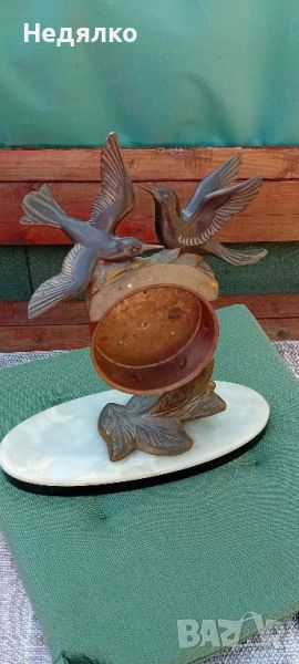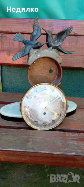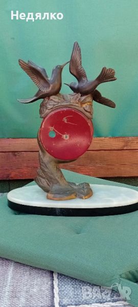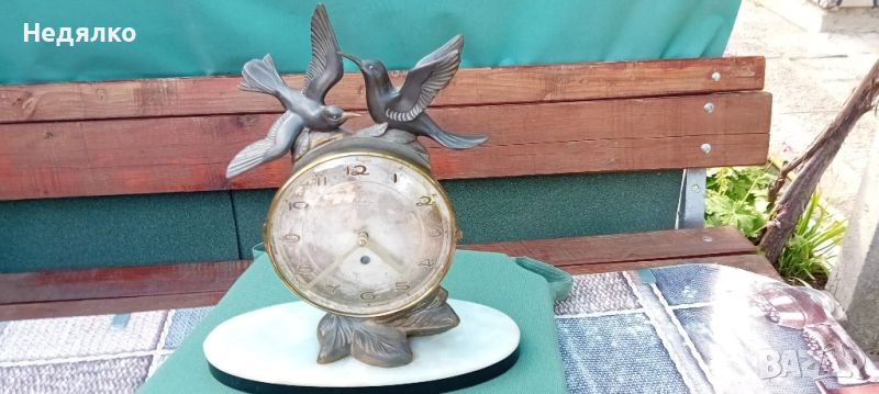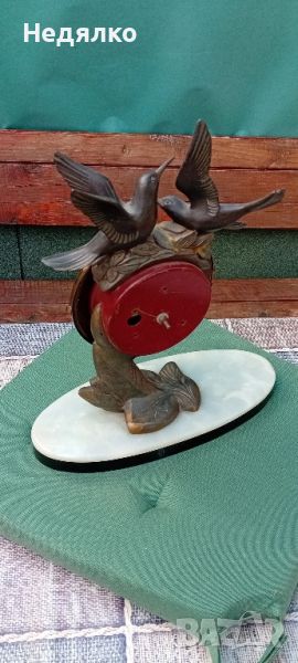 Рядък,стар и автентичен,механиката е заменена с оригинален винтидж френски кварцов механизъм,работещ,основа от бял и черен оникс,колибритата са от бял бронз,с патина и следи от позлата,другото също е бял метал,не го лови магнита,алуминиев циферблат,днес му сложих нова батерия,тежи около 4 кг,основа-30 см,височина,35см,диаметър на часовника-16см.