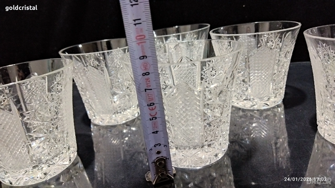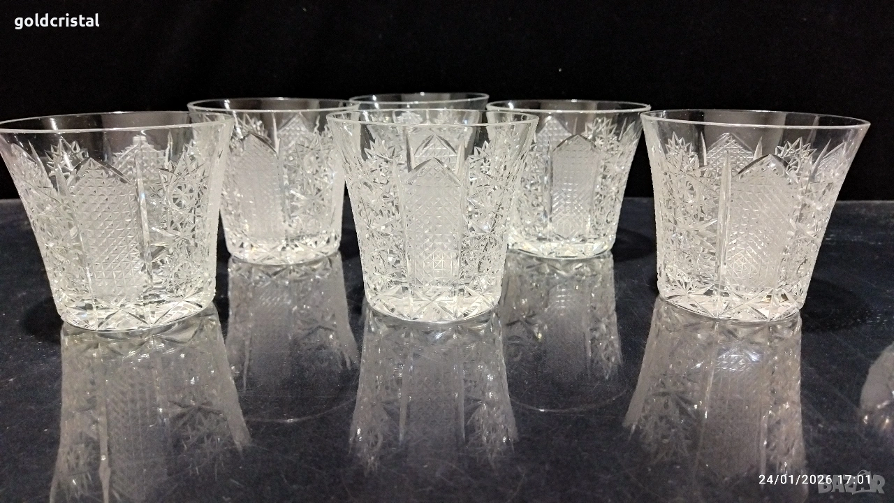 Кристални чаши за уиски 6 броя Стар български кристал луксозна серия богата ръчна гравюра неизползвани без забележки сервиз комплект сет лот ретро арт декор винтидж колекция стари антикварни предмети обзавеждане за дома и семейството подходящи за подарък за ценители и колекционери
