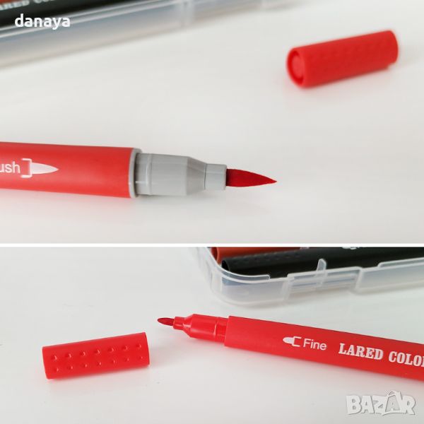 Двувърхите флумастери от Lared разполагат с 2 различни върха – объл (fine tip) и тип четка (brush tip) за направата на фини детайли и комфортно оцветяване. Маркерите с двоен връх са идеални за добавяне на акценти и детайли в различни арт и крафт проекти. Те са подходящи за писане, рисуване, скициране и могат да се използват върху всички видове хартия и картон. Цветните маркери с двоен връх имат ергономична триъгълна форма на корпуса и вентилирана капачка, която предотвратява бързото им изсъхване.