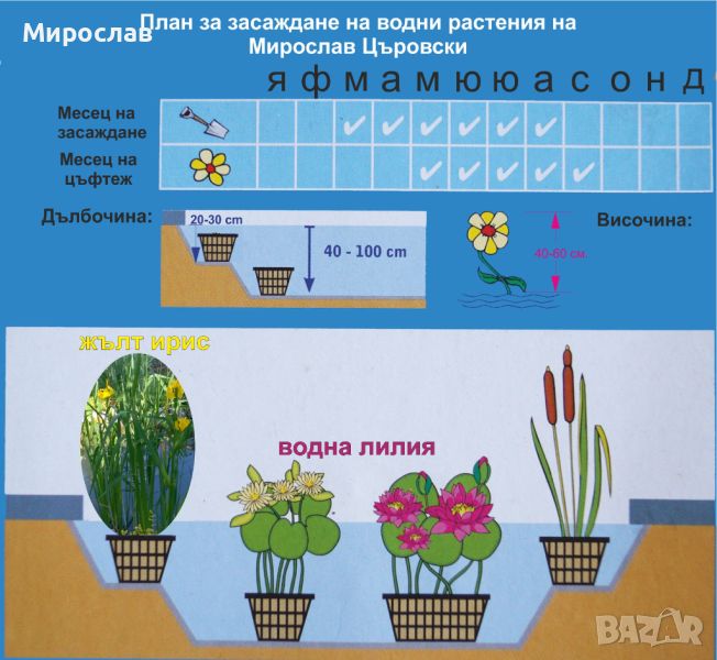 отглеждане, студоустойчиво и много красиво. Достига височина 40 - 70 см. Цветовете са трайни и могат да се използват за рязан цвят. Водният ирис има