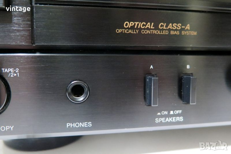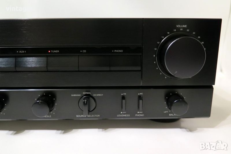 Транзисторен стерео усилвател, отличен технически, много добър външен вид. Корекции: bass 100 Hz/10 dB, treble 10 kHz/10 dB, loudness. Селектор за MM/MC дози. Много добър саунд! Приложените снимки са реални!
