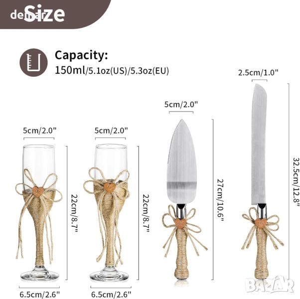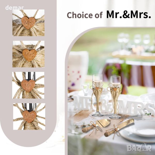 Този елегантен сватбен комплект се отличава с флейти за шампанско с рустикална тематика от чул, всяка украсена с „Mr“ и „Mrs“ върху дървени табели и увити в канап, идеални за подаръци за двойки и добавяне на чар към сватбените приеми. Ръчно издухани по традиционни методи, флейтите и първокласният нож за торта от неръждаема стомана и сервиз са проектирани с изящна изработка. Идеални за различни тържества като годишнини и партита, тези части са чудесни и за ежедневна употреба. Комплектът, който включва две чаши за шампанско от 150 ml и комплект за сервиране на торта, се предлага красиво опакован, което го прави вечен подарък за поводи като домакинство и Свети Валентин.