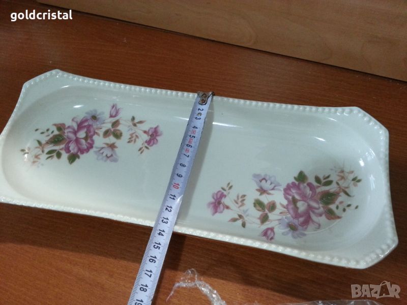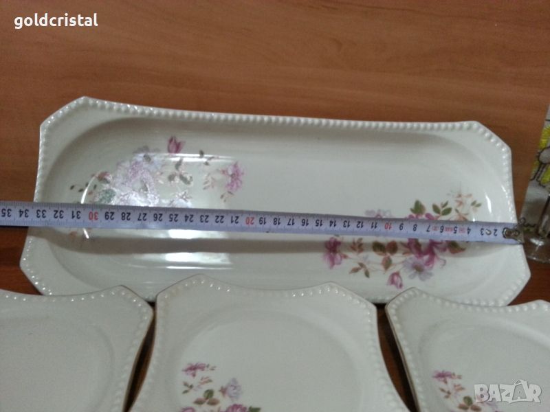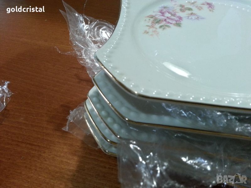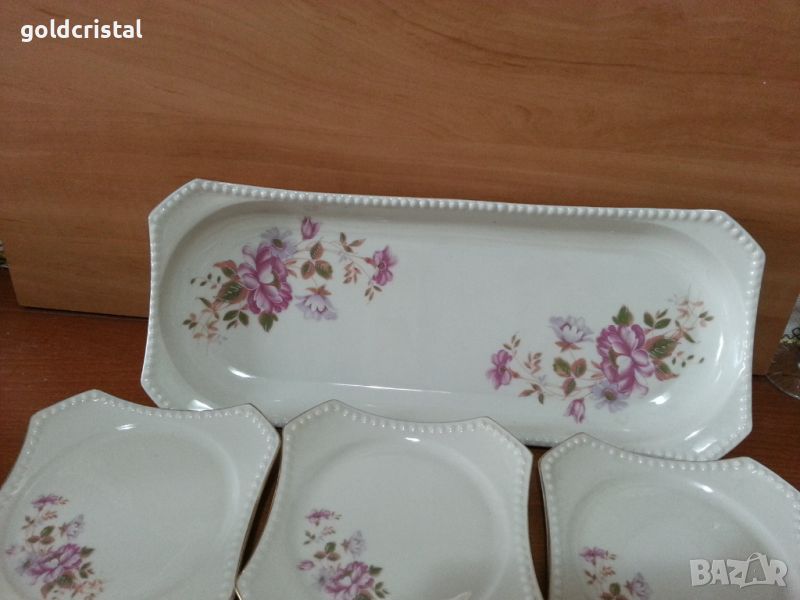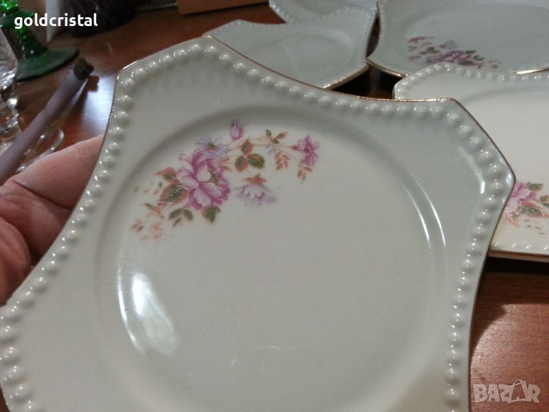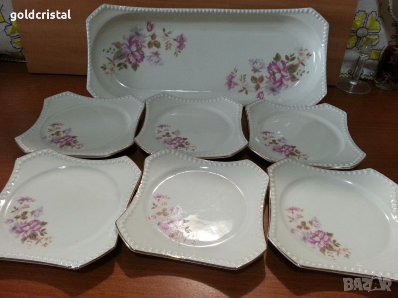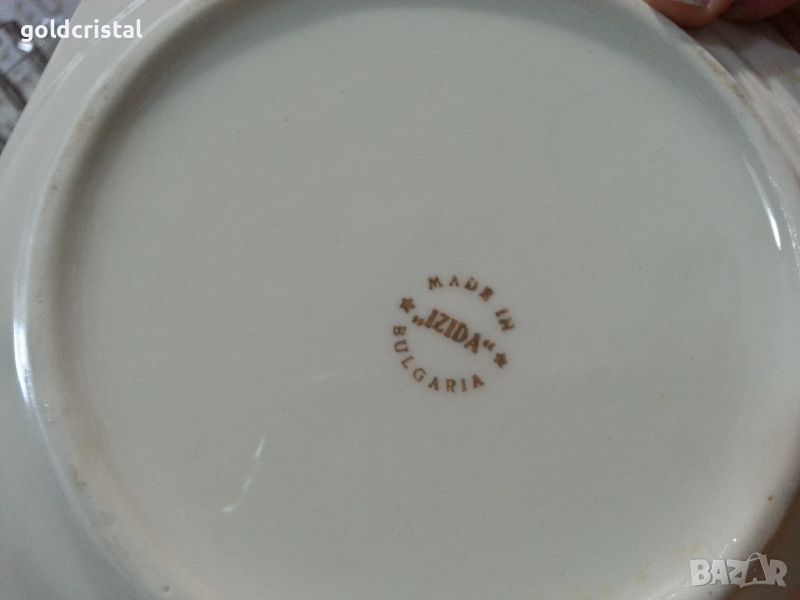 Стар български порцелан Изида 6 бр чинийки и едно плато неизползвани в синя плюшена кутия златен кант сервиз комплект сет лот ретро арт декор винтидж колекция стари антикварни предмети обзавеждане за дома и семейството подходящи за подарък за ценители и колекционери