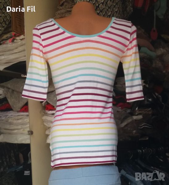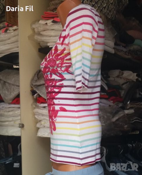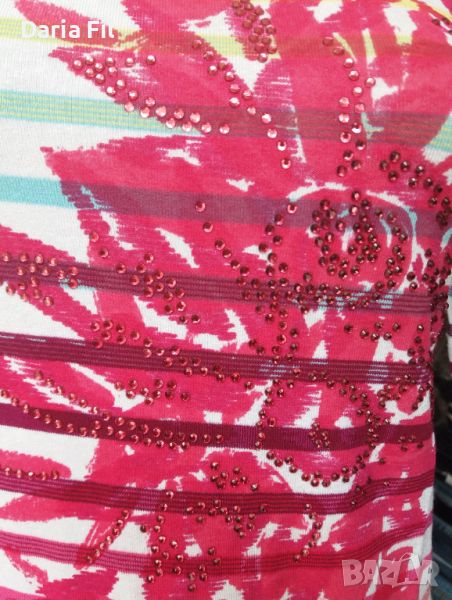 КРАСИВА блуза в пъстро райе и с щампа червено цвете с червени камъчета по нея → Обява 45389451