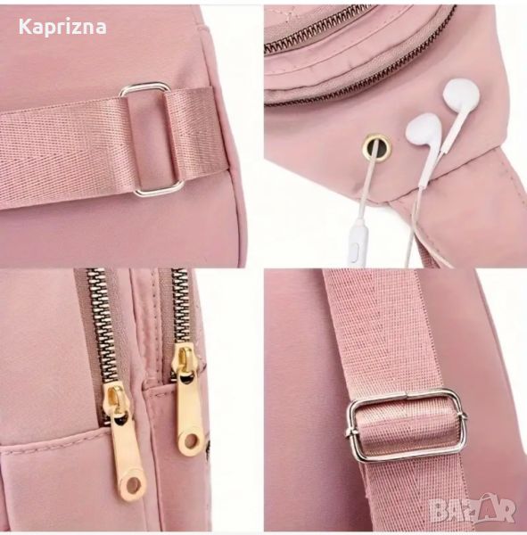 Чантата е с три джоба с цип- голям, среден, малък, един джоб без цип и извод за слушалки.