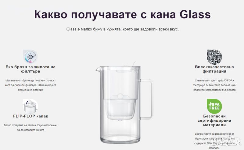 батерии - нашият индикатор за живота на филтъра работи без никакво въздействие върху околната среда.Материалите, използвани за каната Glass, са безопасни и могат да бъдат рециклирани.