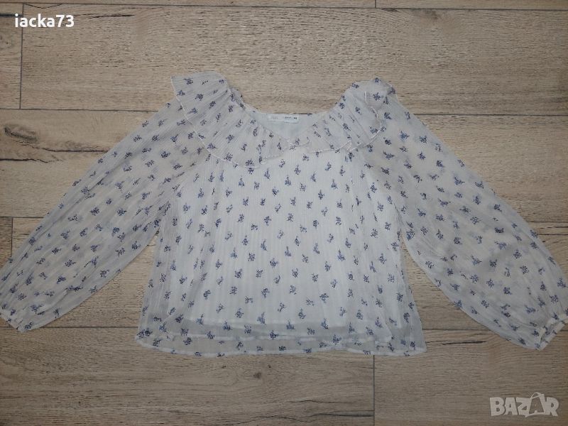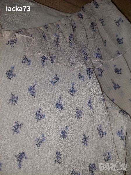 Нежна,ефирна ризса на Зара солей с уширени ръкавчета ,разкраено моделче в пепелно розово с малки лилави цветчета. Отдолу е с памучна подплата без ръкавите. В горната част с допълнителен пласт къдри. Уникална,стои много красиво. Към нея добавям дънки на Манго,слим моделче, тъмен деним,мекички с регулиране в талията. И двете са размер 11-12г. Отлично запазени