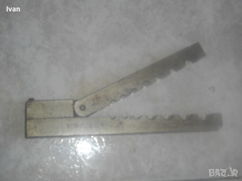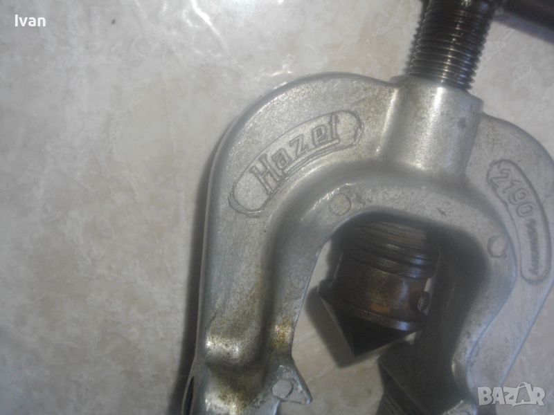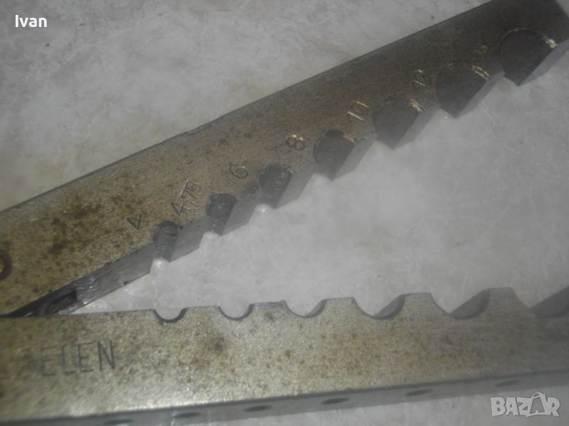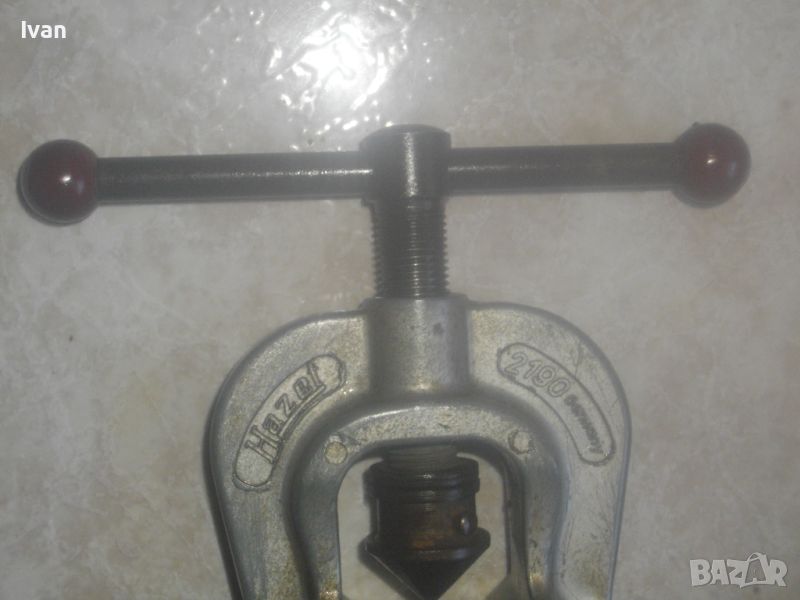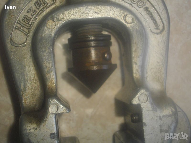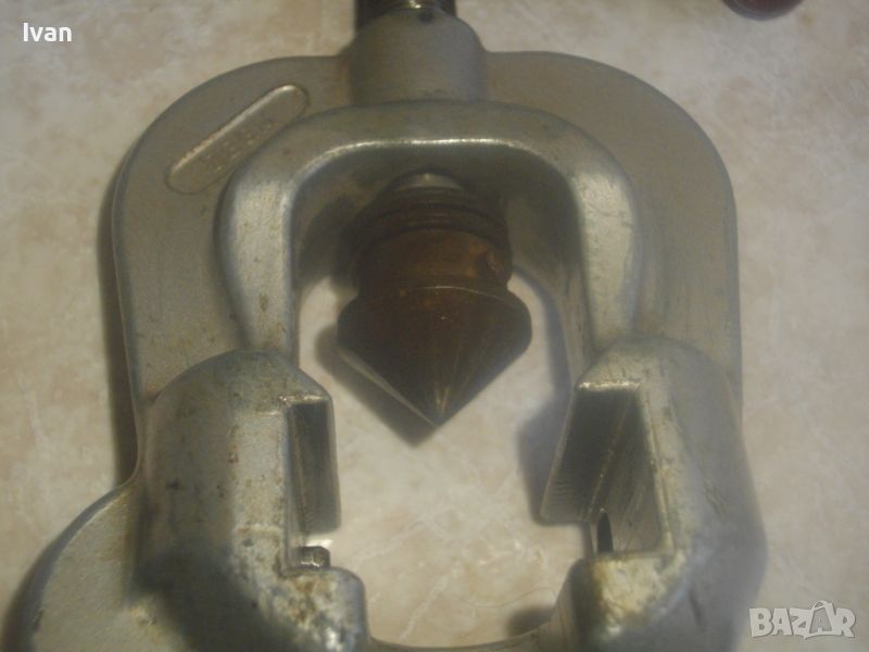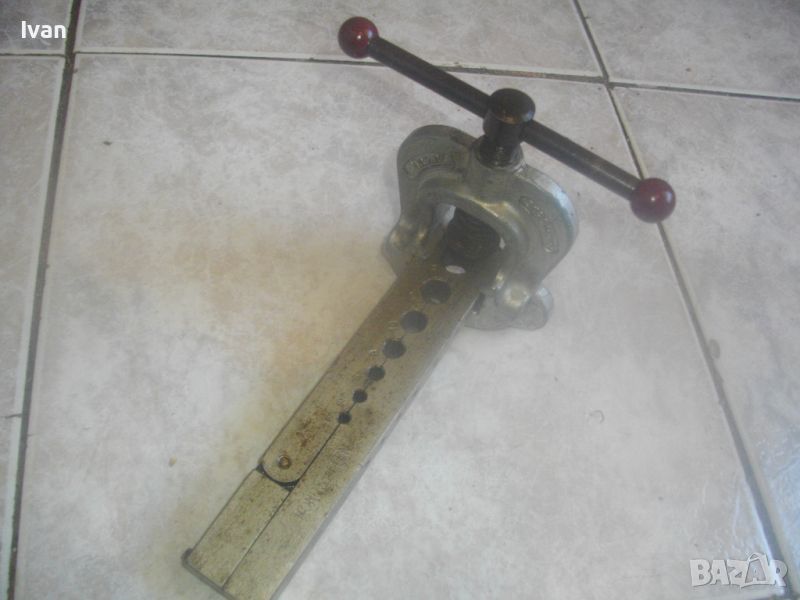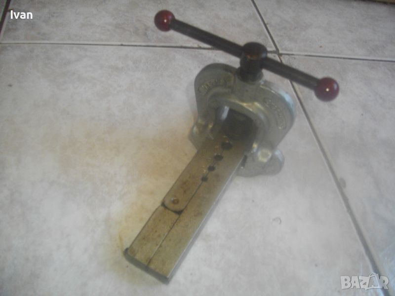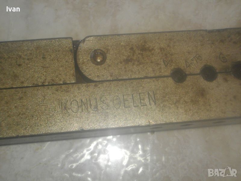 ОПИИСАНИИЕ на конусна дъска със сепаратор - цена 259 лв. Немска професионална висок клас. Инструмента е предназначен за направа и ремонт на тръби - медни/месингови/алуминиеви/ меки стоманени с дебелина на стената до 1 мм. Ползва се за изработката и ремонта на спирачни тръби, горивопроводи, тръби на клиатици и охладителни уредби. Немско оригинално маркирано професионално производство на проесионална марка. Марка и модел - HAZET 2190 Germany . Маркиран стандарт за качеството -DBGM. Конусната дъска е от масивно плътно желязо. С размери за тръби диаметър 4,75 мм, 6 мм, 8 мм, 10 мм, 12 мм, 14 мм. Маркировка на дъската - Konusoelen. Тегло на дъската само - 1,0 кг, дължина 180 мм, ширина 35 мм, височина дебелина 18 мм. Конусната стяга /репаратора/ е изцяло алуминиева, маркирана Hazet 2190 - Germany - DBGM. Центровият конус на стягата за притягане на тръба е от инструмнтална закалена стомана. Винтовият болт на стягата е от същата масивна стомана, с бакелитови топки на крайщата на въртока. Тегло на конусната дъска и сеепаратора - 1,5 кг. Цена на двете общо 259 лв. Твърда цена/без коментар. Дъска и сепаратор не сее разделят. РАЗПОЛАГАМ с други ралични конусни дъски, включително и професионални фрнски старо качество на VIRAX за тръби до 22 мм
