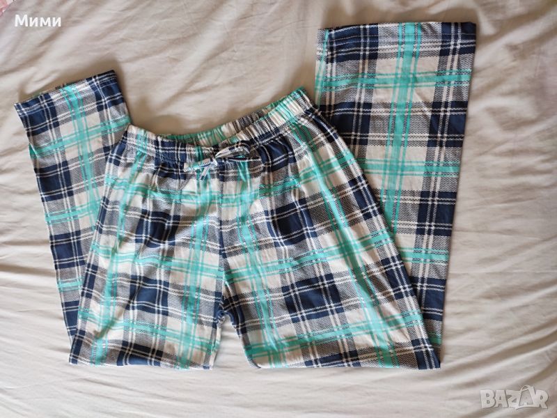 Нова дамска пижама с дълъг ръкав, тънка с мече и карирано долнище в зелен цвят.