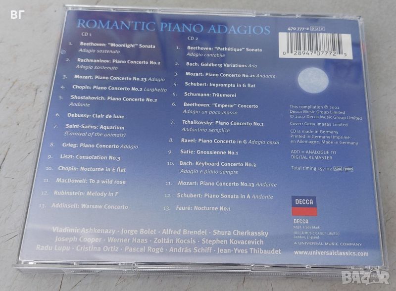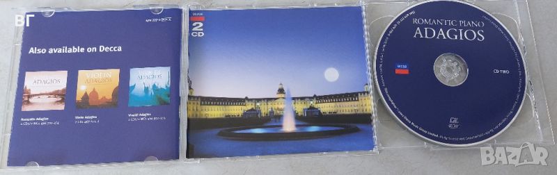 Various Artists – Romantic Piano Adagios (2 Audio CD-а) – Decca 2002 г., 26 трака. Класически хитове: „Moonlight Sonata“ (Beethoven), „Piano Concerto No.2 Adagio“ (Rachmaninov), „Nocturne Op.9 No.2“ (Chopin), „Träumerei“ (Schumann) – идеално за релаксация и класически фенове. В кутия с booklet.