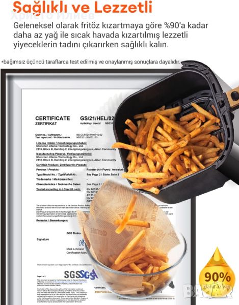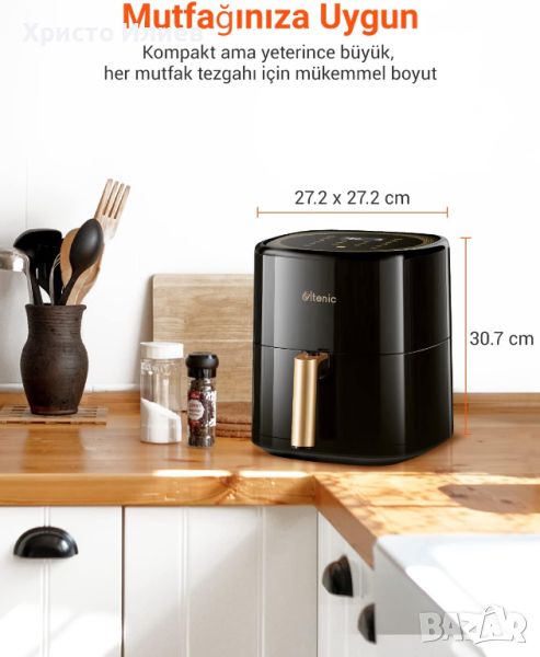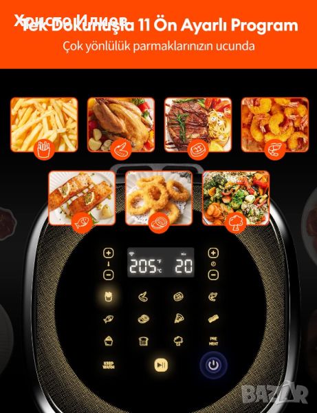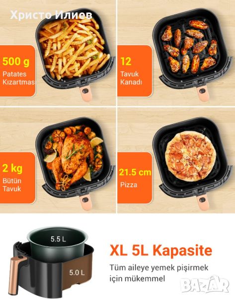 фритюрник с горещ въздух, 5 функции: Постигнете по-горещи, по-бързи и по-хрупкави резултати с технологията с двоен въздух на Ultenic K10 Air Fryer. Тази иновативна технология ви позволява да готвите храната си до четири пъти по-бързо, отколкото във фурната, като същевременно намалява съдържанието на масло с до 90%. Това ще запази повече хранителни вещества в храната ви в сравнение с традиционните методи на готвене като пържене и пържене.Размер XL с капацитет 5 л и лесен за употреба дизайн: Сервирайте до 5 души без усилие или пригответе без усилие цяло пиле на барбекю. Капацитетът от 5 л е идеален за семейни ястия, докато компактният дизайн пасва безпроблемно на всеки кухненски плот. Насладете се на повече удобство с ергономичния контролен панел със сензорен екран, който ви дава ясна представа за напредъка на готвенето и осигурява лесна работа и подобрена видимост.Станете професионалист в готвенето за една минута: Използвайте 11 практични предварителни настройки с един бутон, за да приготвите без усилие разнообразие от ястия, включително пържоли, пиле, морски дарове, скариди, бекон, замразени храни, чипс, зеленчуци, кореноплодни, хляб и десерти. Разширете кулинарните си хоризонти с безплатната готварска книга със 100 рецепти и открийте по-често срещани и професионални рецепти в приложението Ultenic, които можете да запазвате и персонализирате.Спестяване на енергия и пари: Намалете разходите си за енергия с до 80% с въздушните фритюрници Ultenic. Насладете се на 30% по-бърза подготовка и 80% по-малко консумация на енергия. Възползвайте се от бъдещето на ефективното готвене - надстройте до Ultenic Air Fryer и спестете сега!Надеждна безопасност и почистване без усилия: без PFOA и без BPA, изпитайте максимална безопасност с нашия материал, подходящ за съдомиялна машина. Нашият въздушен фритюрник разполага с кошници за пържене и тави за чистачки, изработени от безопасна за храна неръждаема стомана, които са без мирис, устойчиви на корозия и лесни за почистване. Насладете се на удобството на подходящи за съдомиялна машина кошници и тави (когато са достатъчно големи). С ергономична топлоустойчива дръжка, функция за автоматично изключване при изваждане на кошницата и нехлъзгащи се подложки, вашата безопасност е на първо място във всяко кулинарно приключение.Потопете се в кулинарна магия с приложението Ultenic: Изтеглете нашето приложение Ultenic днес! Освободете свят на вдъхновение с над 100 безплатни онлайн рецепти, сезонни деликатеси и експертни съвети. Кажете сбогом на монотонността на ястията и открийте неограничени вкусни възможности.