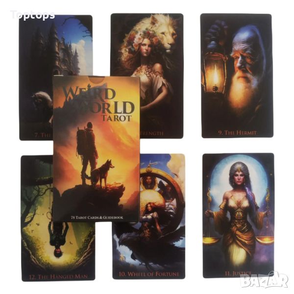 - 78 таро карти - Weird World Tarot. Размерът им е 7x12cm, автор е Mykola Taradaiko.