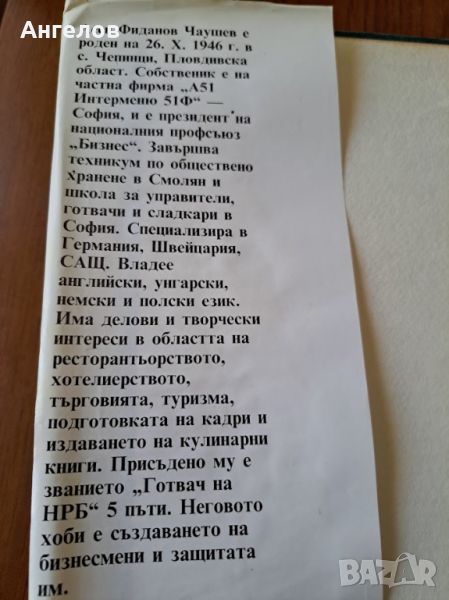 Българската кулинарна библия! Авторът Асен Чаушев пет пъти е обявяван за готвач №1 на Народна република България. Второ допълнено и коригирано издание 1991 г. 450 страници, твърди корици с обложка, която е малко повредена. Книгата е иначе чисто нова!