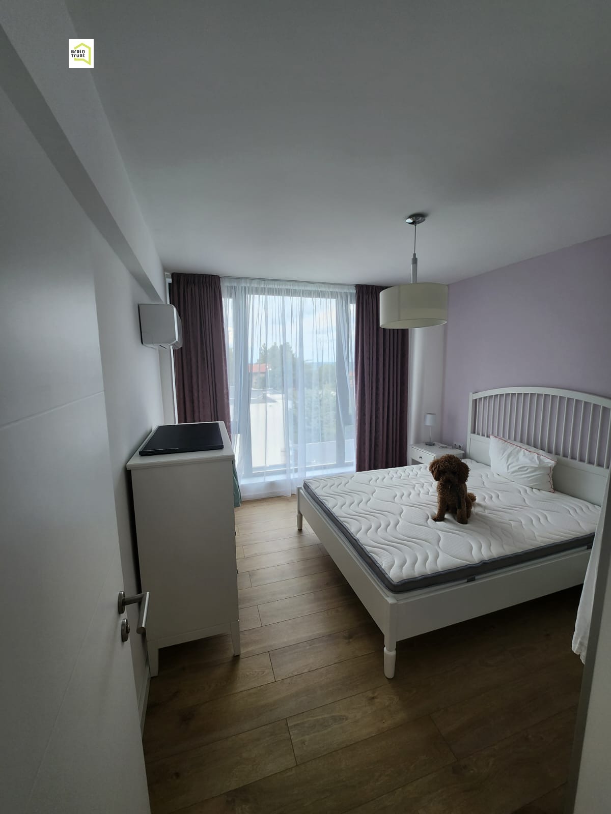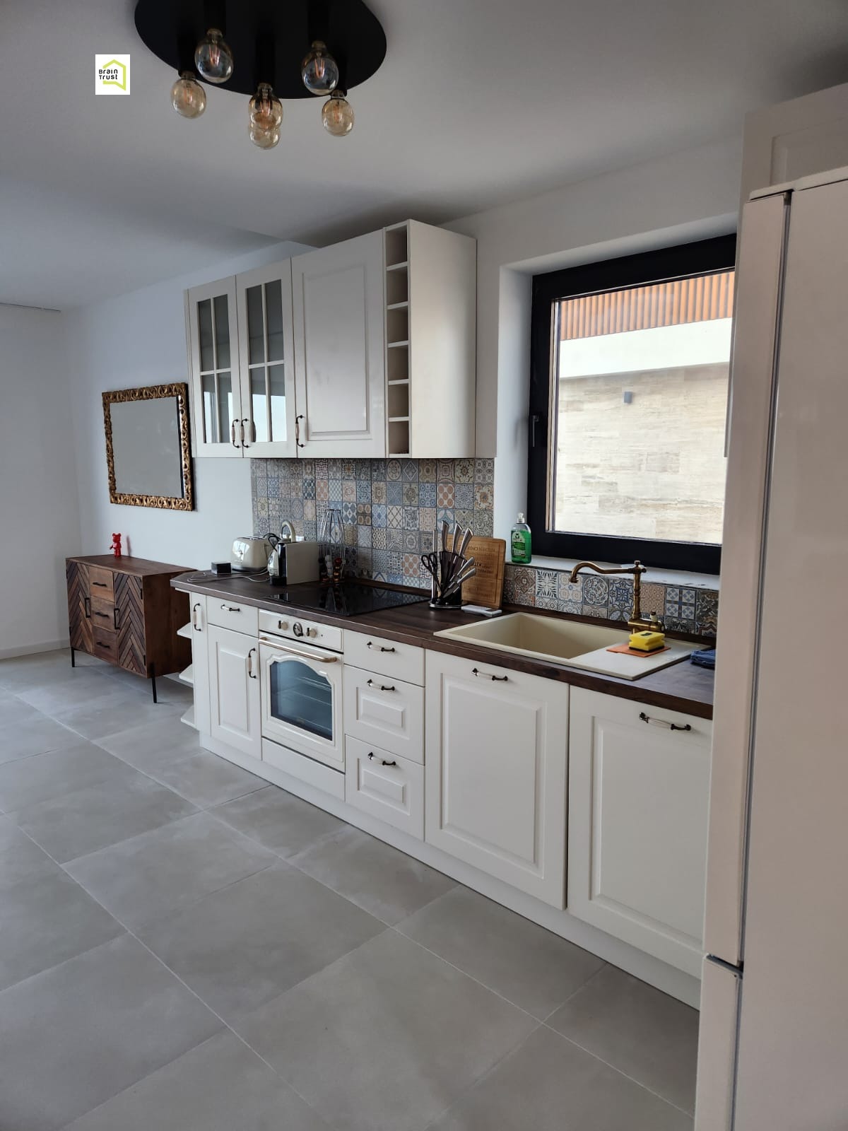 - Първи етаж: На първия етаж се намира просторна всекидневна зона с трапезария и кухня, тоалетна за гости, малко коридорче и уютна веранда.