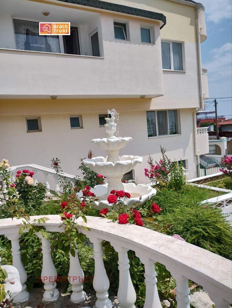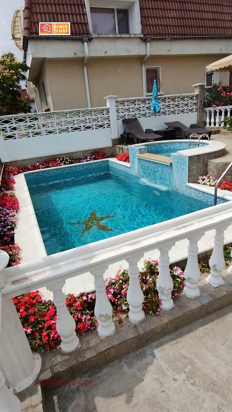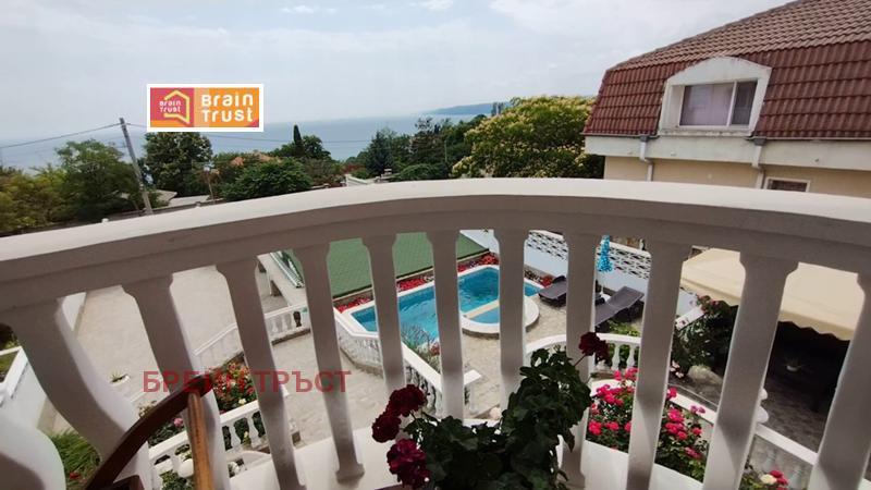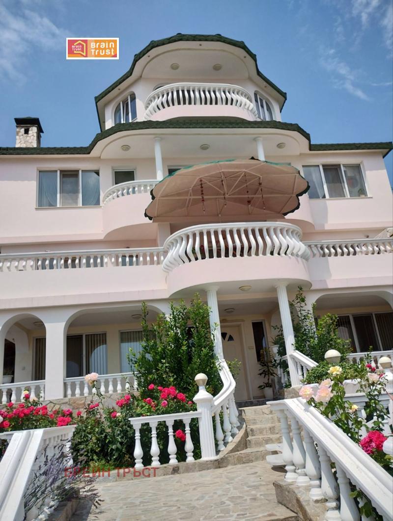 Предлагаме за продажба разкошна 4-етажна къща с площ от 500 кв.м, с панорамна гледка към морето, разположена във в.з. Долна Трака, гр. Варна. Имотът разполага със дворно място с площ от 750 кв.м, гаражи за шест коли, малък басейн с джакузи, зона за отдих с шатра, барбекю, камина и тоалетна с душ. Дворът е поддържан, отрупан с красиви рози и вечнозелени храсти.