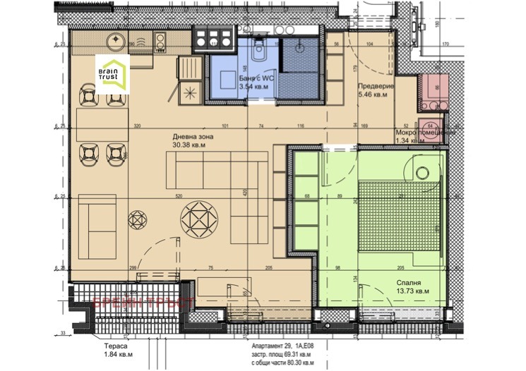 Предлага се за продажба 2-стаен апартамент, разположен на осми етаж, със западно изложение. Чистата жилищна площ е 69.31 кв. м и е разпределена по следния начин: простерна дневна част - хол, тряпезария, кухненски бокс, спалня, баня с WC, мокро помещение, една широка и 2 по-малки тераси.
