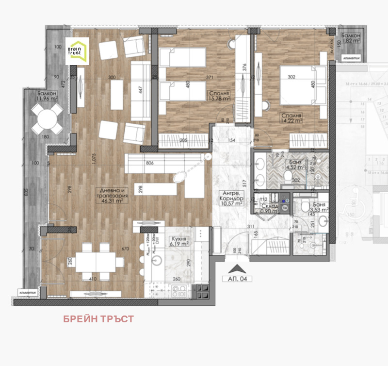 Жилището е на втори етаж, с чиста площ от 129 кв.м и разпределение: всекидневна с трапезария и кухненски бокс, две спални, две бани с тоалетна, антре и просторна тераса.