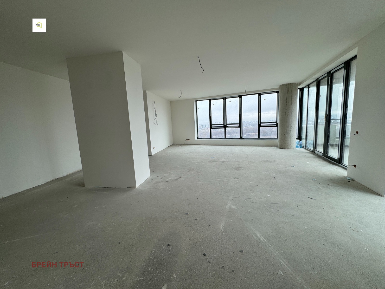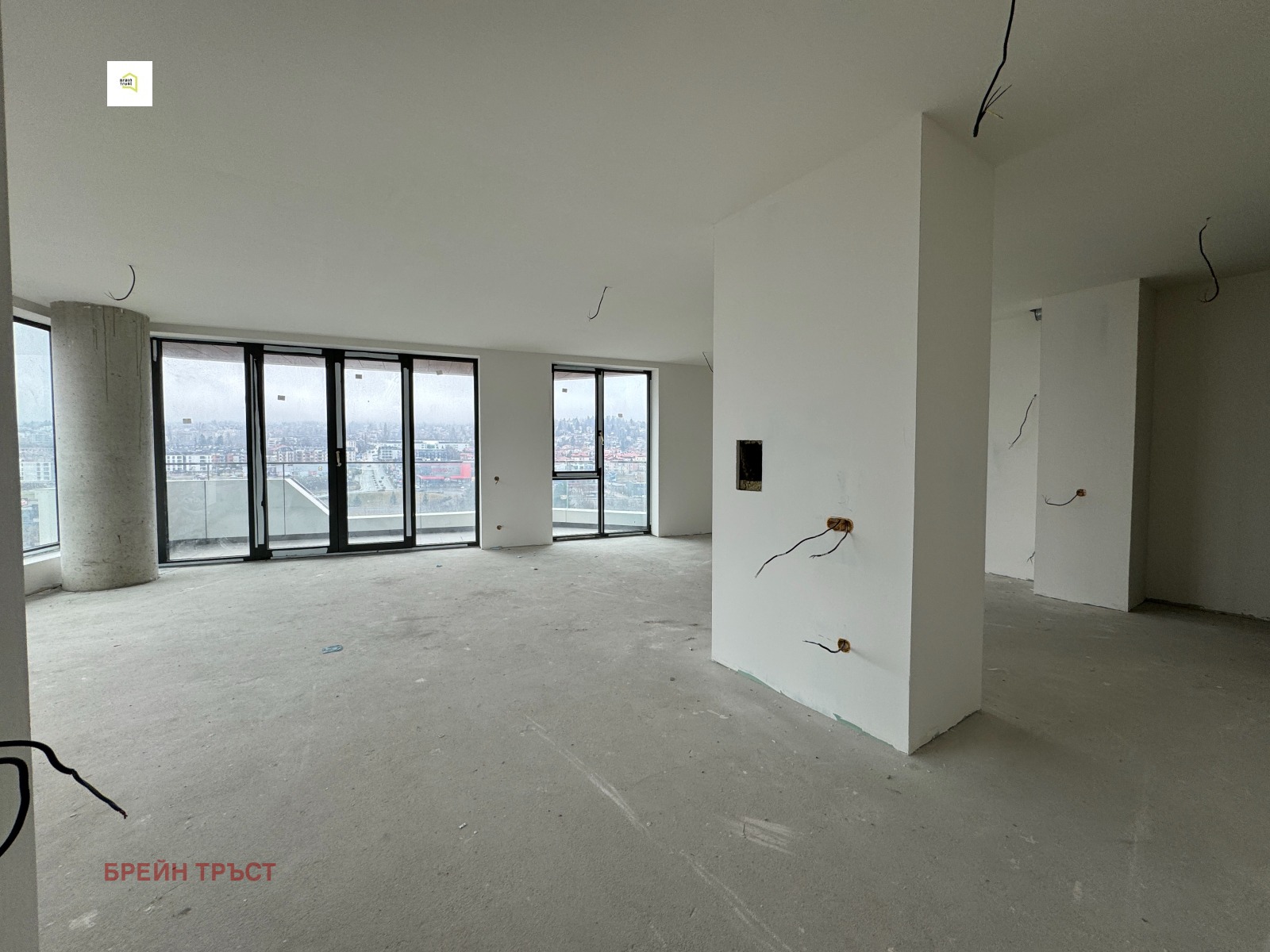 Апартаментът се намира на 13-ти етаж с чиста площ от 186,68 кв.м. със следното разпределение: просторна дневна с кухненски бокс, три спални, три бани с тоалетна, гардеробна и две тераси с прекрасна гледка.