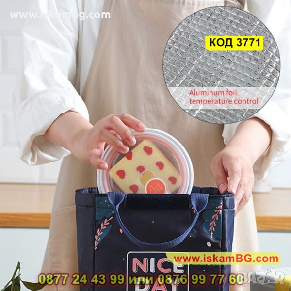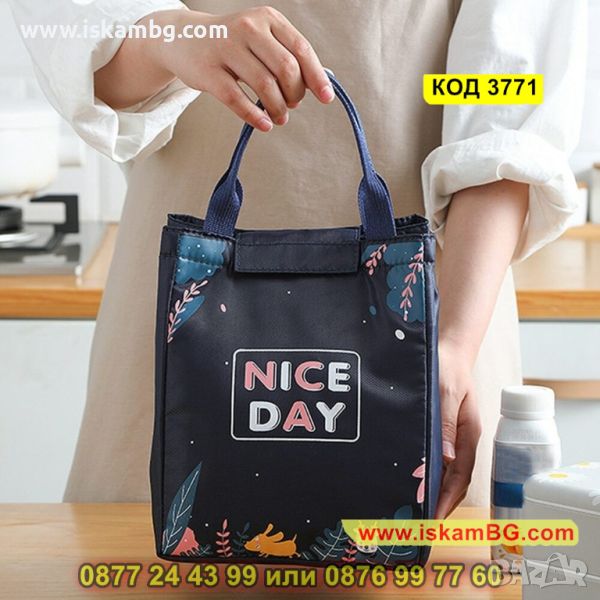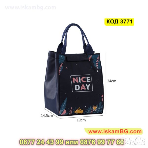 Симпатична чанта за храна и напитки с изолиращо фолио във вътрешната си част. С много свеж принт върху всеки модел и вдъхновяващи надписи. Чантата се отваря и затваря с велкро лепенка. С удобни дръжки за лесно носене. Компактен размер, супер лека и приятна на допир материя. Чантата е с широко приложение – може да се използва като чанта за детска кухня, чанта за разходки в парка, чанта за съхранение на обяда за училище на детето, на къмпинг, в планината, на плажа и т.н.