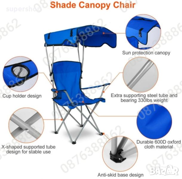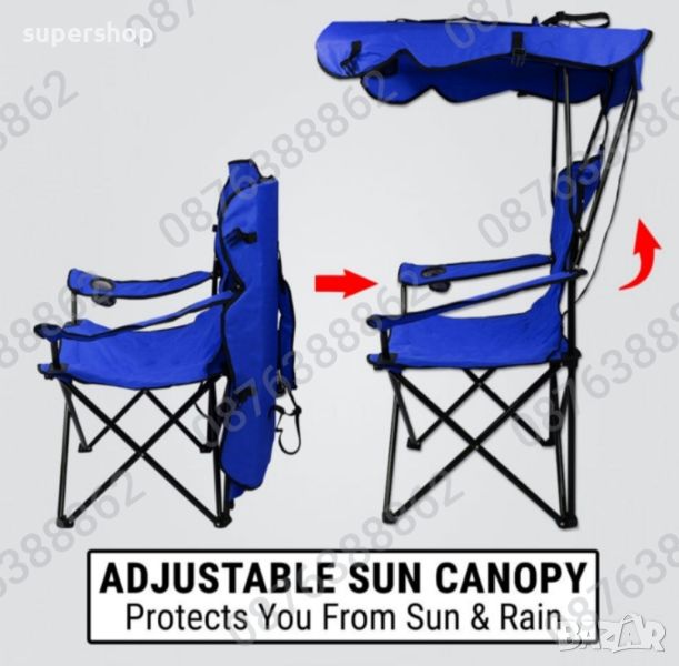 Сгъваем туристически стол със сенник поставка за чаша, стол за риболов 92/130 см.