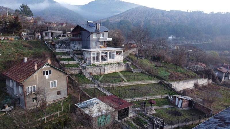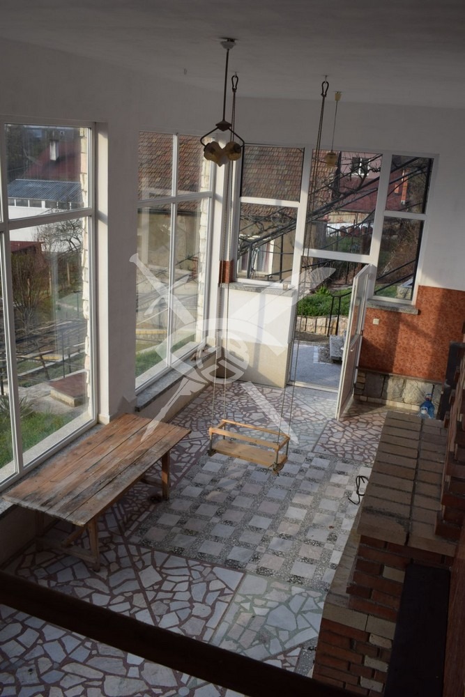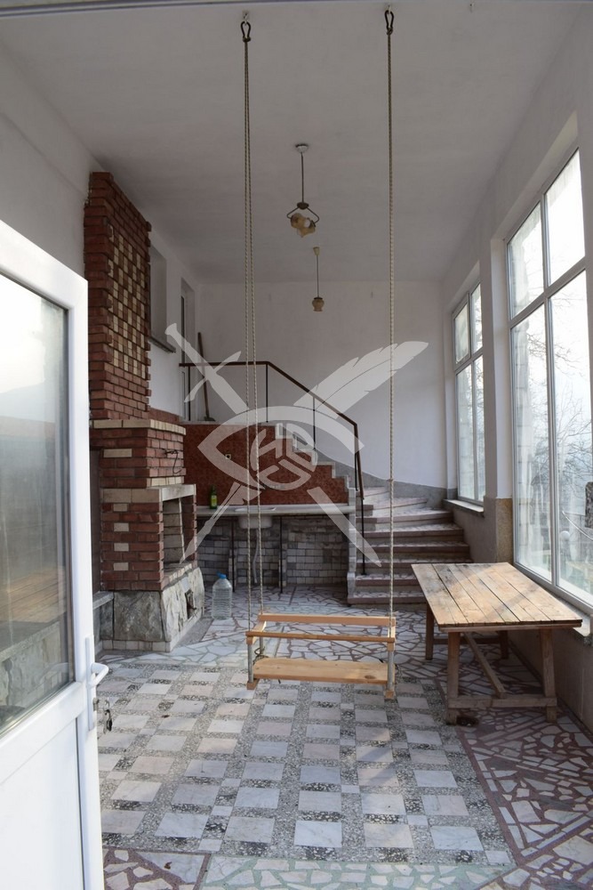РАЗПРЕДЕЛЕНИЕ: Къщата разполага с площ от 300 кв.м., разпределена на два етажа. Приземният етаж разполага с кухня с траперазаря, килерно помещение, тоалетна и механа с два изхода, които отвеждат към зимна градина и тераса. На първия етаж са разположени всекидневна, трапезаря с кухнески бокс, баня с тоалетна, тераса. Вторият етаж е разгърнат във входно антре, три спални помещения, три тераси, баня, килер. ДВОР:1035 кв.м