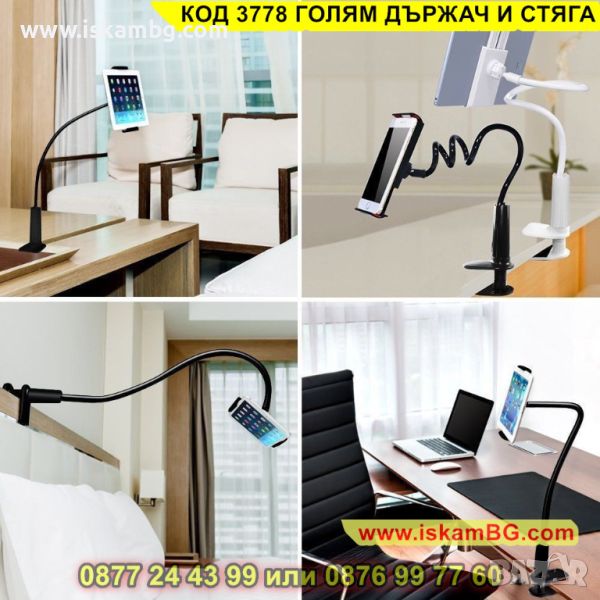 Стойката е изработена така, че да може да бъде прикрепена навсякъде: на леглото, плота, кухнята, масата или бюрото. Този аксесоар е незаменим помощник за да бъде твоя мобилен телефон или таблет на една ръка разстояние. Стойката за телефон и таблет се отличава с високо качество, двойно заключване тип резба с контра и изключителна практичност.