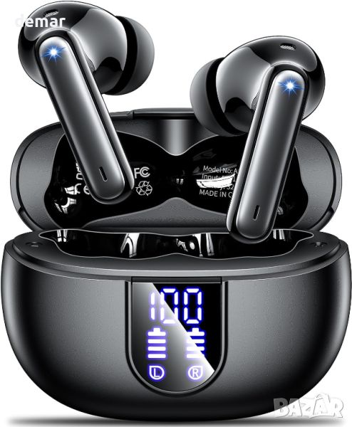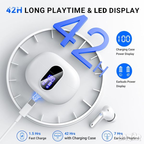 Безжични слушалки Bluetooth 5.3, 42 часа възпроизвеждане LED дисплей IP7 водоустойчиви, бели;черни