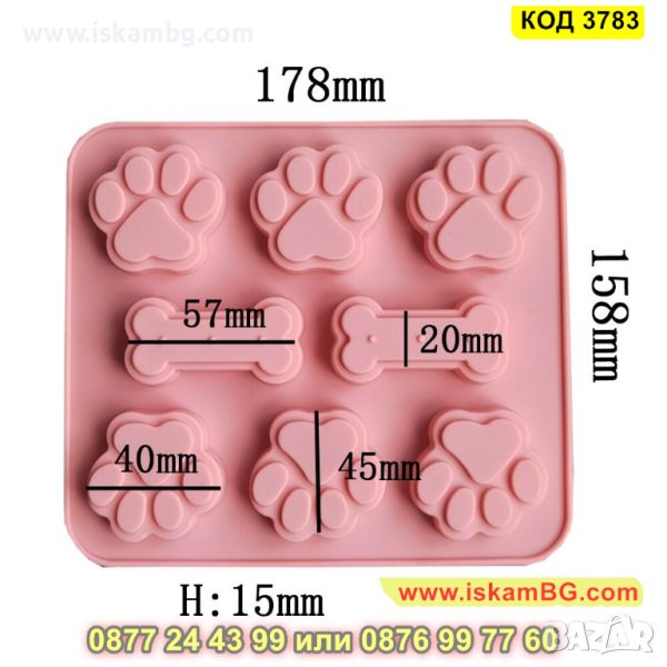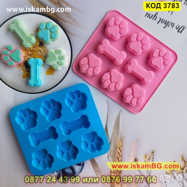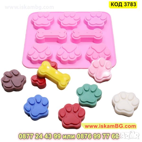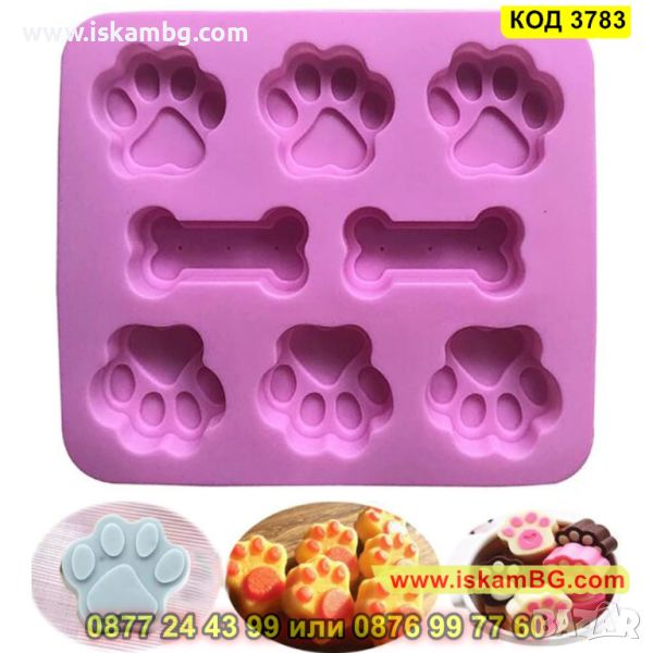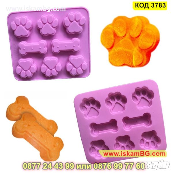 Силиконова форма за печене с незалепващо покритие с 8 гнезда във формата на кучешки лапички и кокали. Издържа на температура от -40 до +230 градуса. Подходяща за използване във фурна, хладилник, фризер, съдомиялна машина. Идеална е за домашни бисквити, мъфини, чийзкейкчета, шоколадови десерти, желе, сладки, сладоледи и т.н. За многократна употреба.