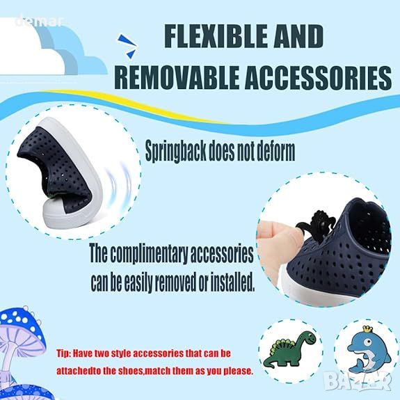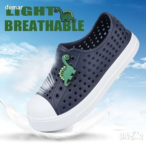 Тези детски обувки за вода са проектирани с неплъзгаща се, бързосъхнеща неопренова материя и гъвкава, дебела гумена подметка, за да предпазят краката от неравни терени и горещи повърхности. Противоплъзгащата се подметка гарантира безопасност при хлъзгави повърхности. Удебелената капачка на пръстите подобрява издръжливостта и намалява износването от удар, докато еластичният маншет и примката за издърпване на петата правят тези обувки лесни за обуване и събуване. Леки и преносими, тези обувки се прилепват към крака като чорапи и могат лесно да се сгънат за съхранение. Идеални за различни дейности като плуване, плажни излети и семейни пътувания, те предлагат защита и комфорт при разходки, джогинг и др. Едната обувка е с динозавър, другата с делфин.