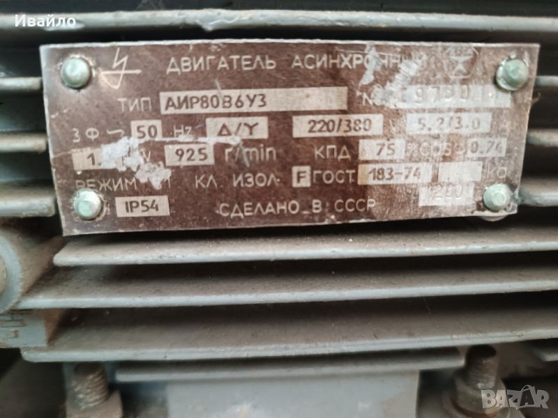 Продавам трифазен електродвигател - 1,1 КВ, 925 об/мин.
