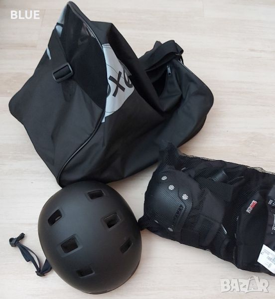 Комплект каска, протектори и сак за ролели. Каска за глава 55/59 см. Протектори за колена, китки и лакти. Размер М, коригират се с велкро ластични ленти. Подходяща екипировка за каране на ролери, тротинетка, скейт, колело.