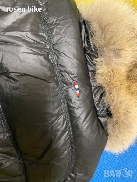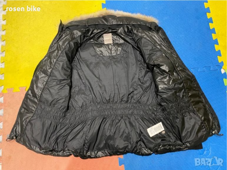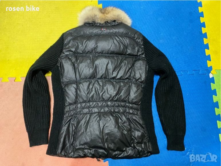''Napapijri''оригинално дамско пухено хибридно яке .отговаря на Л размер.дължина-69 см.подмишници-58 см.талия-50 см.ръкав-66 см.яката е от естествен косъм и може да се сваля.отлично състояние.цената е крайна!