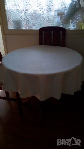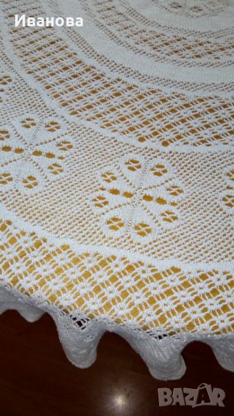 Дантелена покривка, на снимката е върху маса - Ф-90- 15 лв., текстилна мушама от Юск- не е ползвана, диаметър 140 см. /в Юск 17,50 лв./метър,т.е. закупена за 24,50 лв., продава се за 20 лв