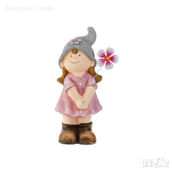 Декоративна фигурка Mercado Trade, керамично градинско момиче с плитки, розова рокля на точки, сива шапка с цвете и метално бяло/фуксия цвете в ръцете.
