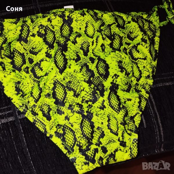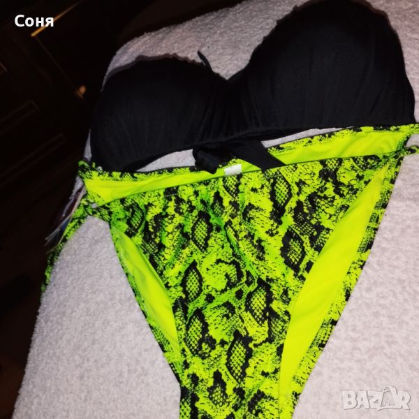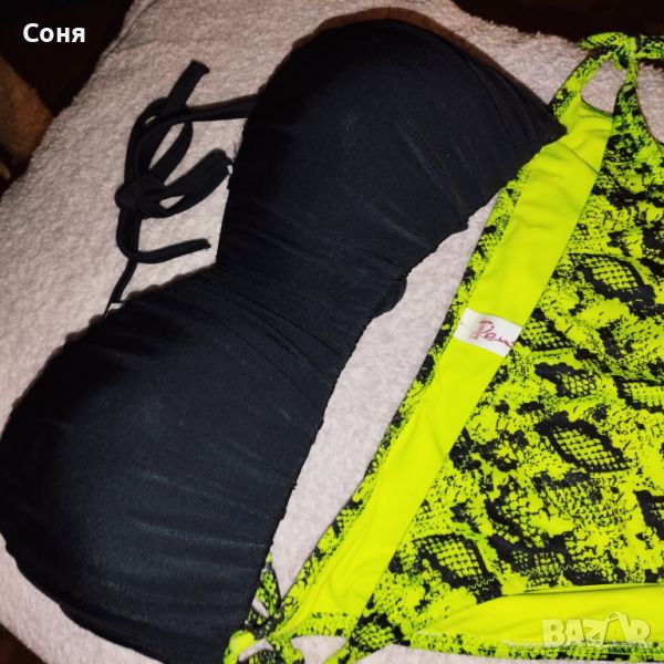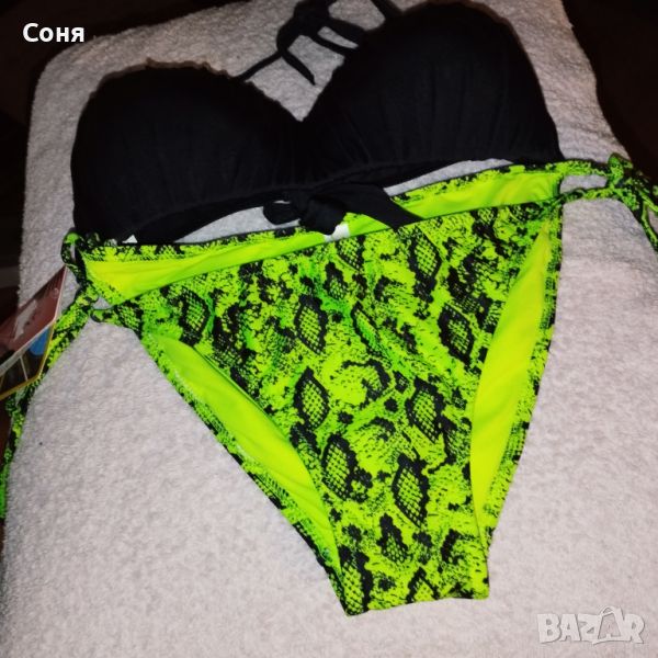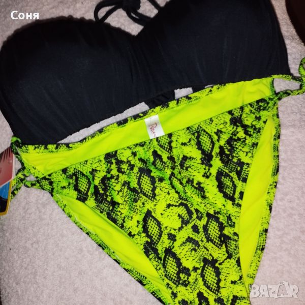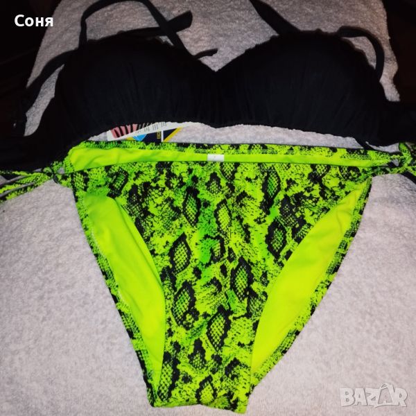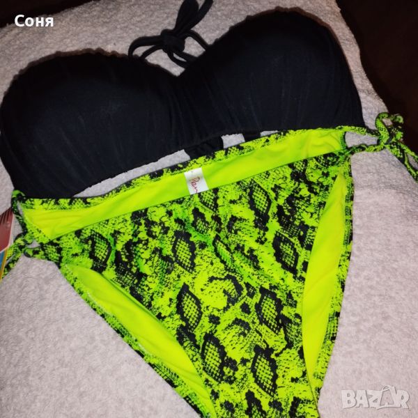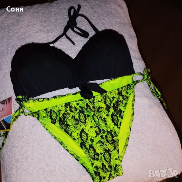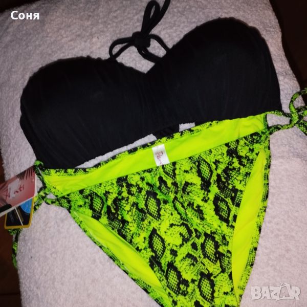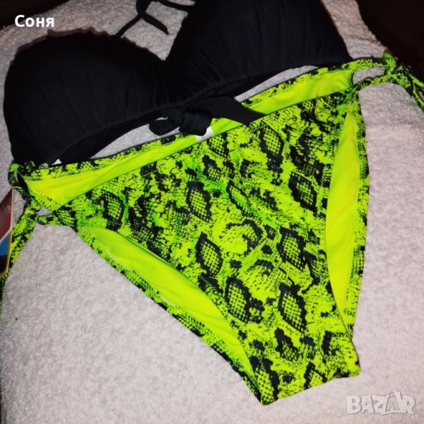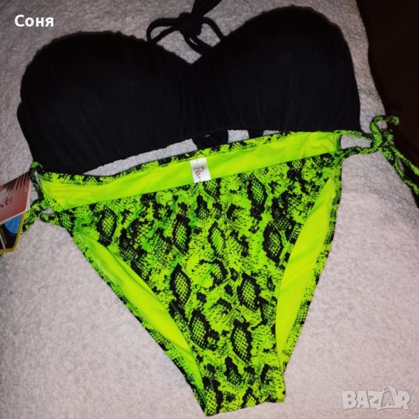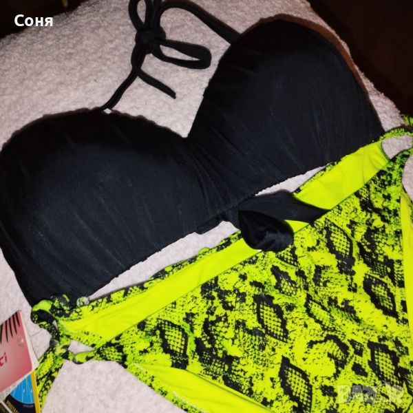 Бански костюм от две части размер M-L, нов, с етикет. Горнището е в натурално черно с пришита отдолна страна тънка подплънка за добра визия на банския, регулира се с презрамки които се връзват на врата и на гърба отзад. Долнището е флуоресцентно електриково жълто с черно - което изключително добре се допълват с летния загар на кожата. Материята е много мека и приятна на допир със високо съдържание на ликра което го прави доста еластичен за добро прилягане към тялото. Бански с който няма да останете незабелязани на плажа.