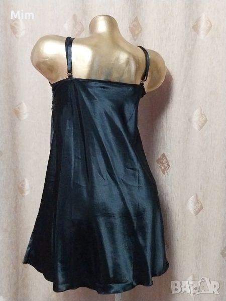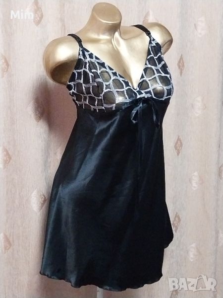 Черна сатенена нощница, на бюста с бродерия с бяла сребриста нишка ,регулируеми презрамки, гръдна 55 см едностранно, ханш 67 см едностранно ,дължина 80 см Няма следи от употреба.
