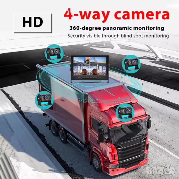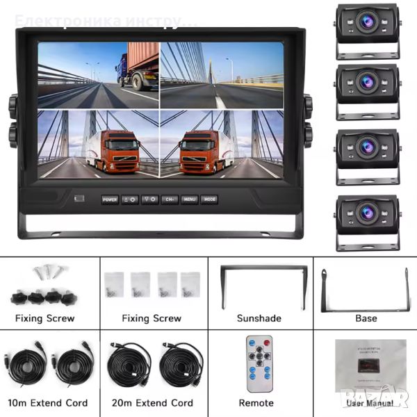 9 ″ LCD монитор с 4 броя камери за видеозапис и заден ход 18 LED IR за висококачествено нощно виждане водо и удароустойчиви.