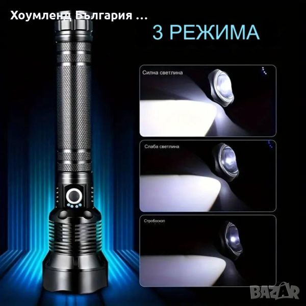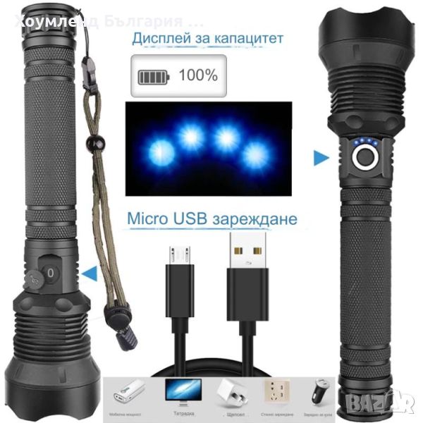 Удобен за ръката дизайн, четири енергоспестяващи електрически индикаторни светлини, ви информират за заряда на фенерчето. Когато всички светлинни индикатори светят, това показва, че фенерчето е пълно с електричество. Когато броят на светлинните индикатори намалее, това означава, че мощността намалява. Когато индикаторните светлини мигат, това означава, че фенерчето трябва да се зареди.