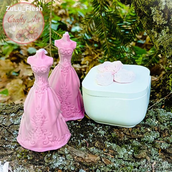 Красиви роклички, подаръчета за гостите на абитуриентския бал, сватба или моминско парти. Свещичките са изработени от натурален соев восък с цвят и аромат по избор. Единично опаковани и с етикетче с надпис или пожелание.