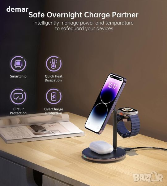 Тази 3-в-1 безжична станция за зареждане, оборудвана със специални магнити, осигурява прецизно подравняване MagSafe за iPhones, Apple Watches и AirPods, поддържайки вертикално и хоризонтално разположение на устройствата. Той зарежда iPhone модели 15/14/13/12 бързо, съответствайки на скоростта на оригиналното зарядно устройство Apple MagSafe и гарантира безопасност със сертификати CE, FCC и Qi. Неговият компактен, противоплъзгащ се дизайн минимизира безпорядъка на работния плот и предпазва устройствата по време на зареждане с настройка на един кабел.