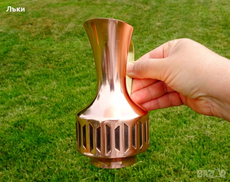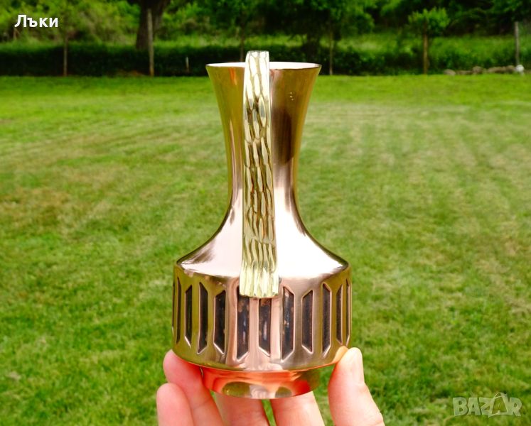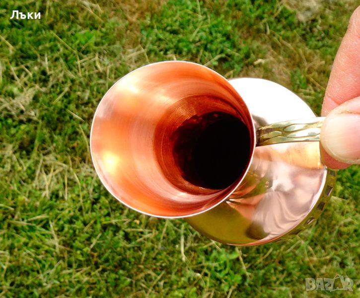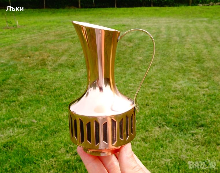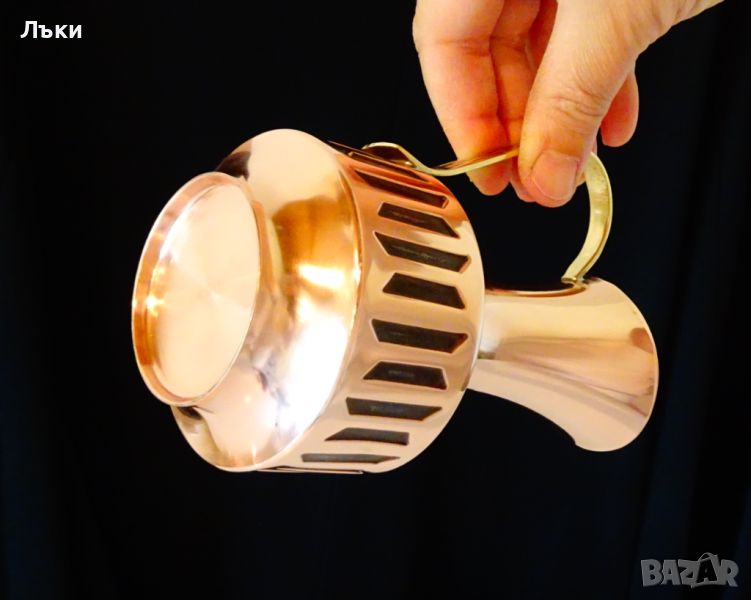 Старинна немска медна кана за ракия,майсторска ръчна изработка с релефна декорация и ниело.Дръжката е изработена от златен месинг с нежен релеф.От вътре не е калайдисана,идеална за медна вода.Височина 15 см.,дължина 8 см.,тегло 130 гр.Вместимост 300 мл.