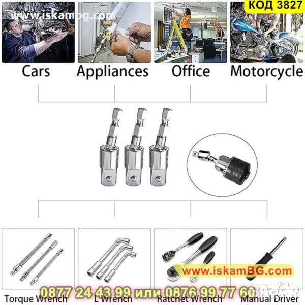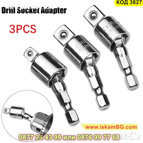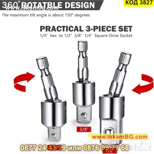Комплект адаптери за винтоверт състоящ се от 3 части, 360° въртящ се и с възможност с промяна на ъгъла им до 150°. Комплекта се състои от 3 адаптора с размери 1/4" 3/8" 1/2"