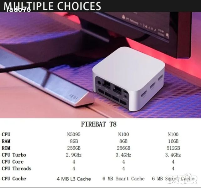 мини компютър може да съхранява всички ваши важни файлове, документи и медии без никакви проблеми.• Свързване WIFI5 BT4.2: Свързването WIFI5 BT4.2 осигурява бърза и стабилна интернет връзка, което ви позволява да осъществявате достъп до любимите си уебсайтове и приложения без никакво забавяне.T8 pro/plus Основни характеристикиИнформация за продуктаХарактеристика:Лек и лесен за пренасяне дизайн, поддържа изходен интерфейс с три екрана, процесор Intel N5095/N100. Позволява ви да работите лесно навън, външен монитор за гледане на филми и т.н., разнообразие от функции правят живота ви по-цветен.Малък хост с два гигабитови мрежови порта, който може да се използва като компютър и сървър. Нисък шум за създаване на комфортна работна среда.Спецификация:процесорПроцесор T8 PRO-Intel® Jasper Lake Celeron N5095T8 PLUS-Intel® Alder Lake N100GPUГрафика Intel®UHDпамет16GB (Вградената памет не може да бъде заменена)Pro-LPDDR4x 2400 HzПлюс-LPDDR5 4800 HzСъхранение512GB M.2 2242 SSD NGFF (Слотът поддържа NVME, максимум до 2TB)ИнтерфейсHDMI *3 (Поддържа едновременно показване на три HDMI.)RJ45*2(1000M LAN)Аудио жак (HP&MIC)*1USB3.1 Type-A * 3мрежаWiFi5, 2.4/5.0BluetoothIntel 7265/ 3165/ RTL8821CE Поддържа Bluetooth 4.2ТеглоОколо 203,7g(нето тегло)Размер89,4 мм * 89,4 мм * 43,5 мм