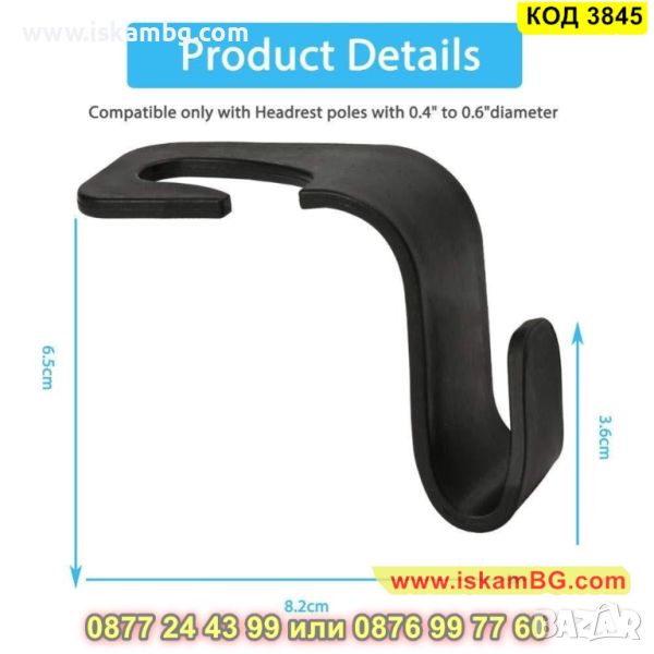 Малката закачалка, която Ви предлагаме е удобна за закачане на задната седалка на автомобила Ви. Тя се закрепва към едната опора на облегалката за глава. На нея ще можете да закачате чадър, яке или чанта за пазар. Също така куката може да се постави и към предната седалка.